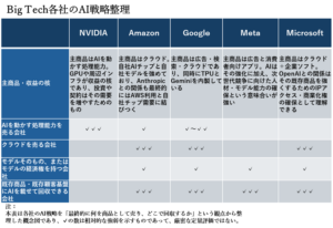 表1:Big Tech各社のAI戦略を「最終的に何を売るか」で整理した比較表