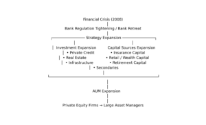金融危機後の規制変化は銀行の役割を変え、そのことがPE会社の存在感拡大を後押しした。さらに投資対象の拡張と資金源の拡張によって、これらの企業は巨大な運用資産を持つ金融機関へと成長した。