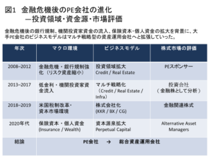 第一段階は、金融危機後から2010年代前半にかけてである。銀行規制の強化や銀行のリスク資産縮小を背景に、その空白を埋める形でPE会社がクレジット、不動産、インフラなどへ事業を広げていった。ここではまず、会社の中身そのものが変わり始めたことが重要である。